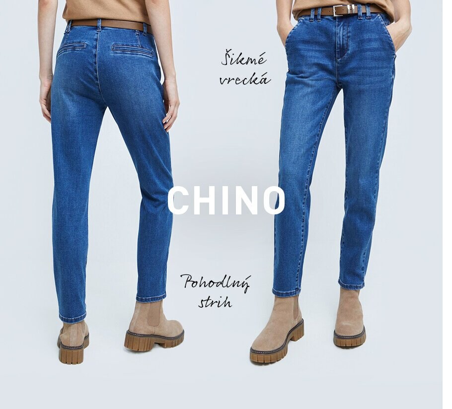 CHINO – džínsy vyznačujúce sa šikmými vreckami a nohavicami, ktoré sa mierne zužujú smerom nadol. Zvyklý tvar predných a zadných vreciek im dodáva ležérny, ale praktický vzhľad. Tento strih je voľnejší okolo bokov, je vhodný pre vysoké aj nízke postavy a, v prípade potreby, dokáže dobre dorovnať proporcie.