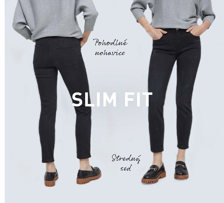 SLIM FIT – vypasované džínsy s úzkou nohavicou, ako okolo stehien, tak aj okolo členkov. Zvýrazňujú prirodzenú líniu postavy, ale príliš ju nesťahujú – sú pohodlné pri každodennom používaní.