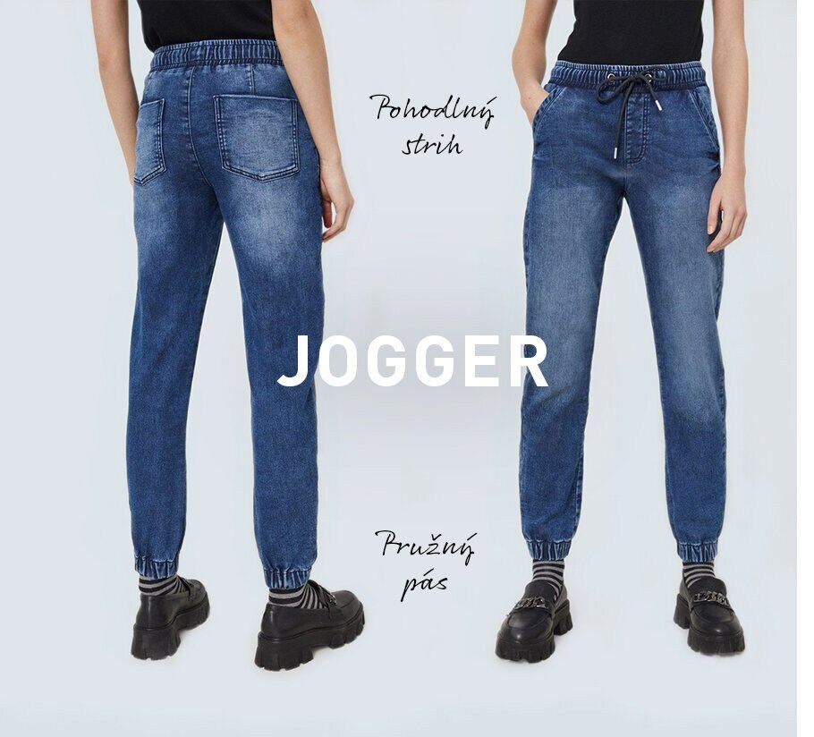 JOGGER – tento strih džínsov sa vyznačuje nohavicami ukončenými elastickou gumičkou. Voľnejšia forma im dodáva mierne streetwearový charakter. Strih bol prevzatý z teplákových nohavíc, preto joggery poskytujú pohodlie, sú univerzálne a vhodné pre akýkoľvek typ postavy.