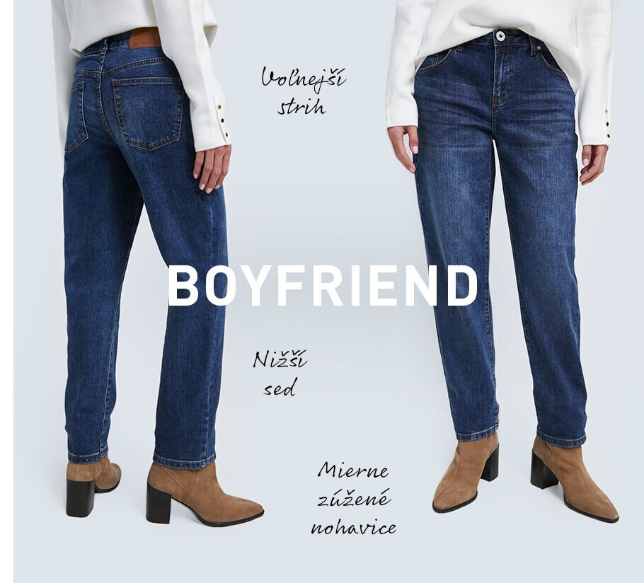BOYFRIEND – voľnejšie džínsy s nižším sedom a s mierne zúženými nohavicami. Niekedy sa zdajú byť príliš veľké, ale ide o zámerný efekt, vďaka ktorému outfit pôsobí ležérne a zároveň zaisťuje pohodlie a komfort.