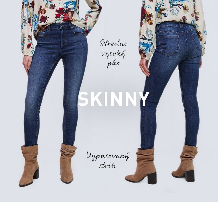 SKINNY – vypasované džínsy s nohavicami zúženými po celej dĺžke, ktoré vytvárajú efekt „druhej kože“. Tento strih zvýrazní pás a celkovú postavu, zatiaľ čo elastický materiál zabezpečí komfort nosenia.