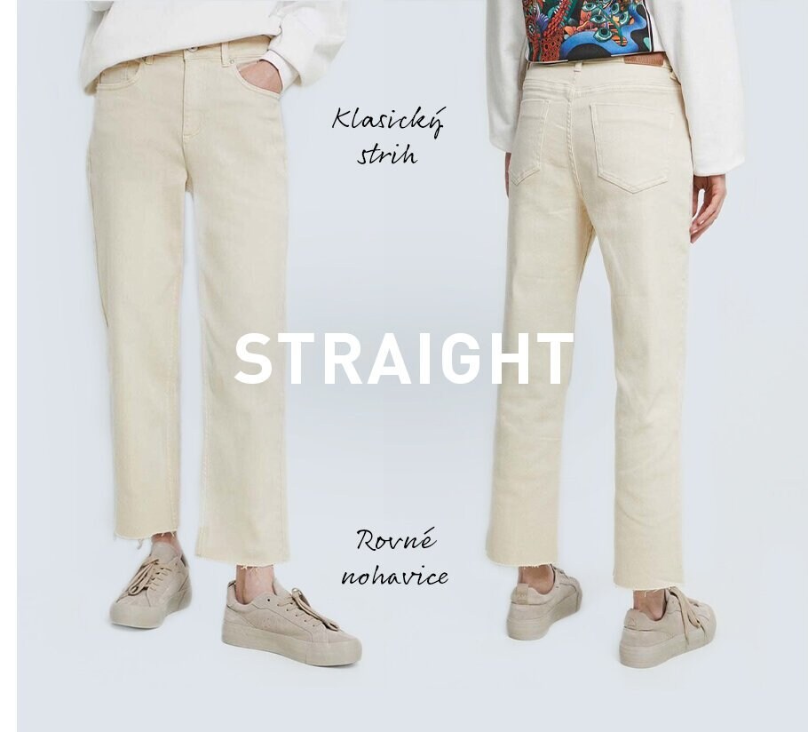 STRAIGHT – klasický strih s rovnými nohavicami a klasickým pásom zaistí voľnosť pohybu a pohodlie pri každodennom používaní. Univerzálny strih džínsov ich robí vhodnými pre každú postavu.